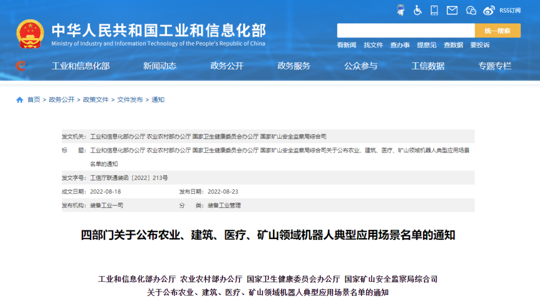 四部门关于公布农业、建筑、医疗、矿山领域机器人典型应用场景名单的通知