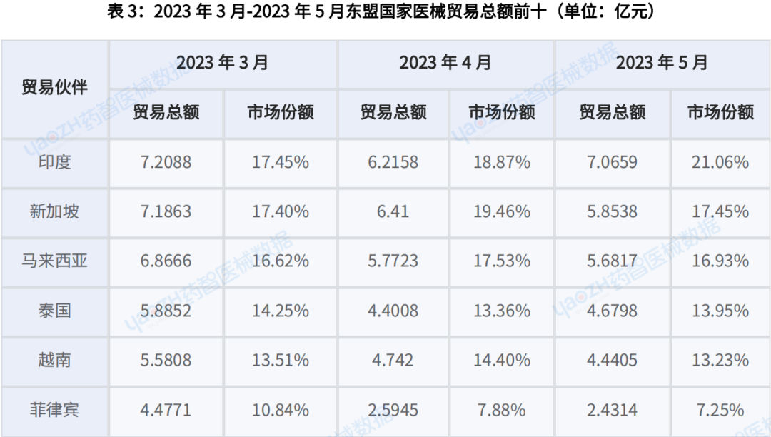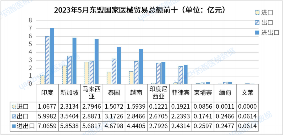 2023年5月,中国对东盟国家进出口33.5547亿元,占中国全球贸易总额9.62%,环比增长1.88%。其中,出口23.8672亿元,占中国总出口额12.68%,环比下降3.41%;进口9.6875亿元,占中国总进口额6.03%,环比增长17.77%。对印度、新加坡、马来西亚分别进出口7.0659亿元、5.8538亿元、5.6817亿元,占同期中国对东盟国家进出口总值55.44%。
