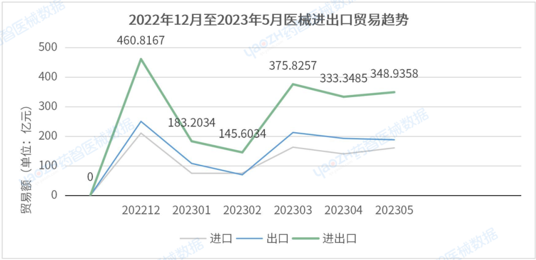 2022年12月~2023年5月,中国器械进出口总额平均增长率-5.41%;其中出口额平均增长率-5.54%;进口额平均增长-5.26%。
