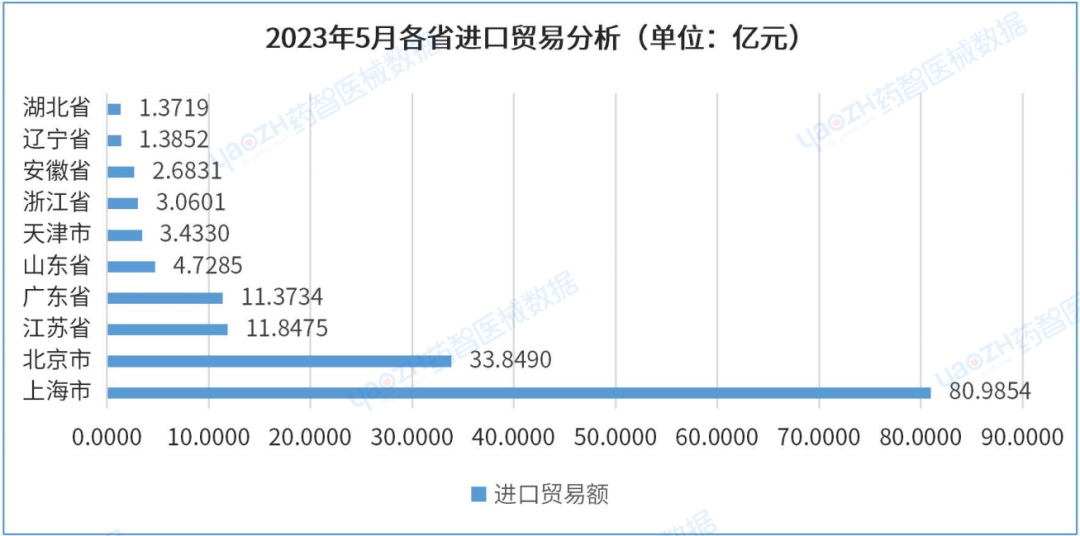 进口方面,2023年5月欧洲市场为最大进口贸易市场,市场份额占比达39.11%。2023年5月中国医疗器械的主要进口地为美国、德国、墨西哥,美国为中国最大的进口贸易国家,占中国进口市场的23.83%。2023年5月中国进口医疗设备的金额占比最高,达56.25%。中国医疗器械进口贸易中,上海市为进口额最大的省份,2023年5月进口额为80.9854亿元。