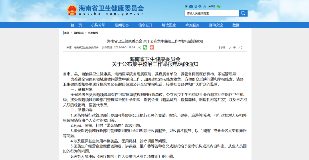 省卫健委发布《关于公布集中整治工作举报电话的通知》,明确了医药反腐中的举报对象和举报范围,海南