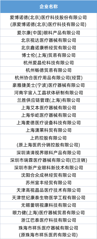 在暂停产品挂网的27家企业中,爱博诺德、视达医疗、鑫诺康桥、新产业等国内眼科企业占大多数;爱尔康、博士伦等少数知名外企也在其中。