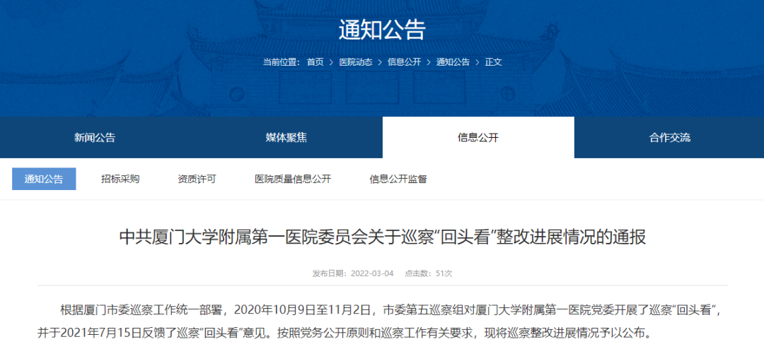 日前,中共厦门大学附属第一医院委员会发表《关于巡察“回头看”整改进展情况的通报》(简称通报),强调对不降价耗材予以停用的问题。