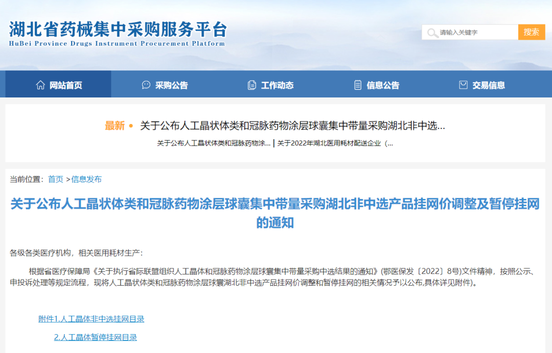 3月10日,湖北省公共资源交易中心发布《关于公布人工晶状体类和冠脉药物涂层球囊集中带量采购湖北非中选产品挂网价调整及暂停挂网的通知》(简称通知)。