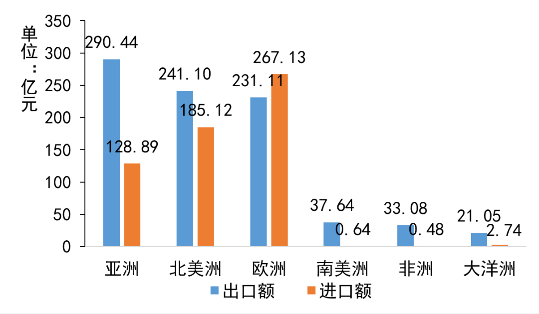 我国医疗器械进出口市场主要位于亚洲、北美洲和欧洲,其出口额分别为290.44亿元、241.1亿元和231.11亿元,进口额分别为128.89亿元、185.12亿元和267.13亿元。