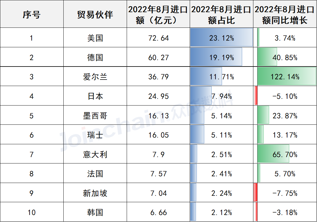 表2 2022年8月我国医疗器械主要进口市场情况