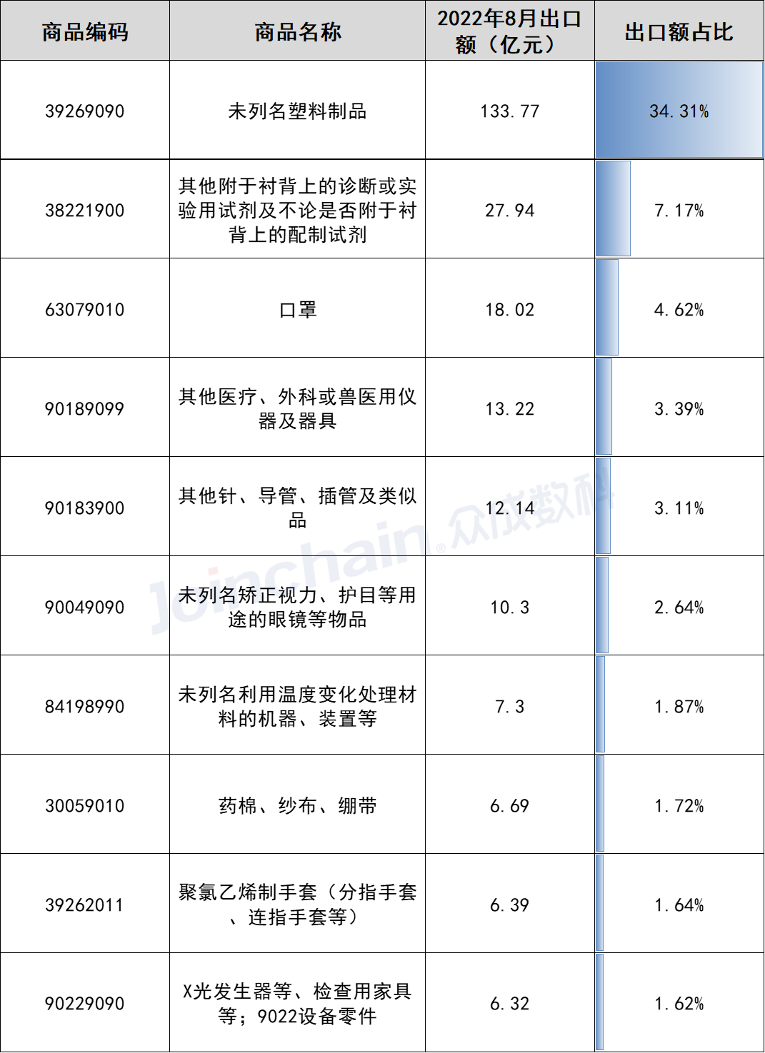 表4 2022年8月我国医疗器械重点商品出口情况