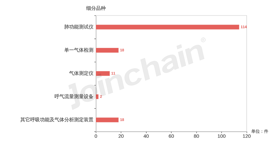 据中标结果显示,肺功能测试仪的中标数量最多,中标数量为114件;其次是其它呼吸功能及气体分析测定装置和单一气体检测,中标数量分别18件和18件。