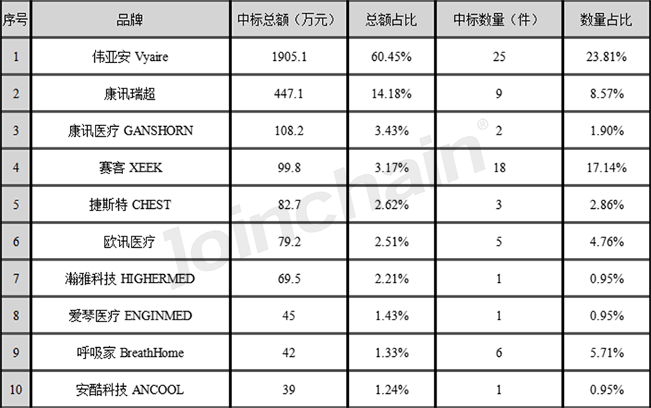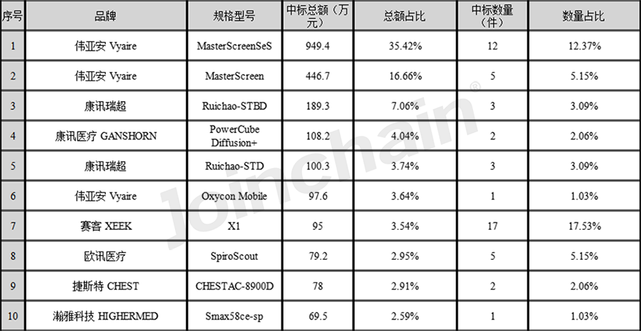 表1 2022年10月呼吸功能及气体分析测定装置品牌中标情况(Top10)